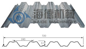 该机生产的楼承钢板,用于楼层楼面板,具有波峰高、强度大等特点,而且生产自动化程度高,成本低廉。