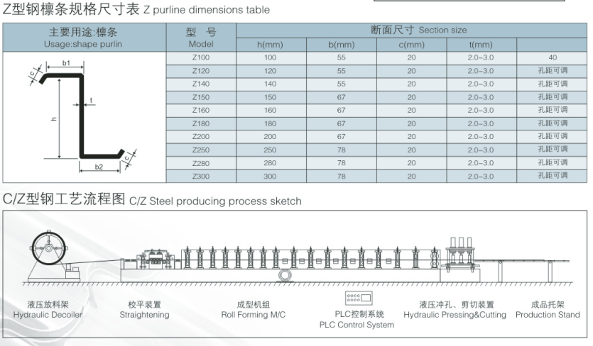 经该机辊轧的c型檩条成品具有良好的抗弯抗压性能,平直度好、全自动定长切割、自动冲孔、自动化程度高,安装快捷方便。 产品可作为大中型工业民用建筑的主体受力结构,如厂房、 仓库、机车库、飞机库、展览馆、影剧院、体育场馆、集市花棚的屋面承重荷载和墙面支撑。
